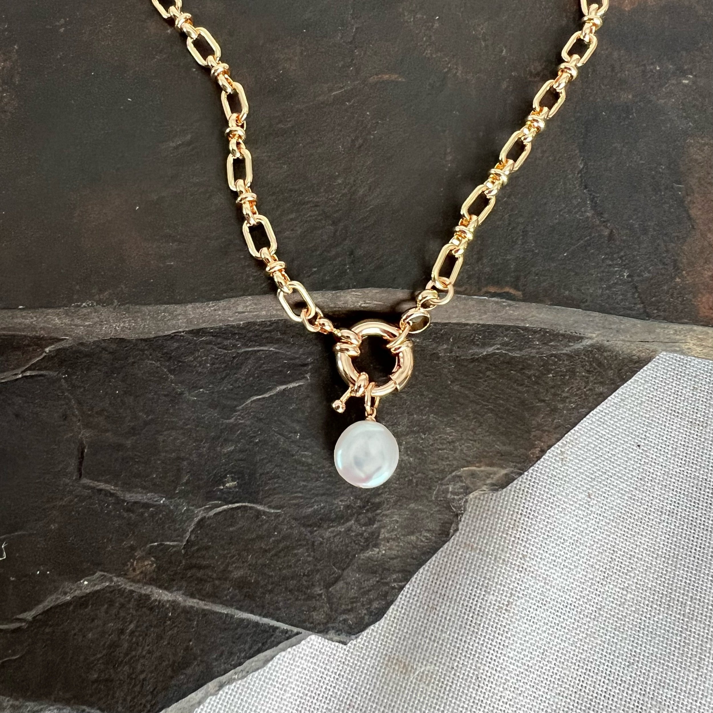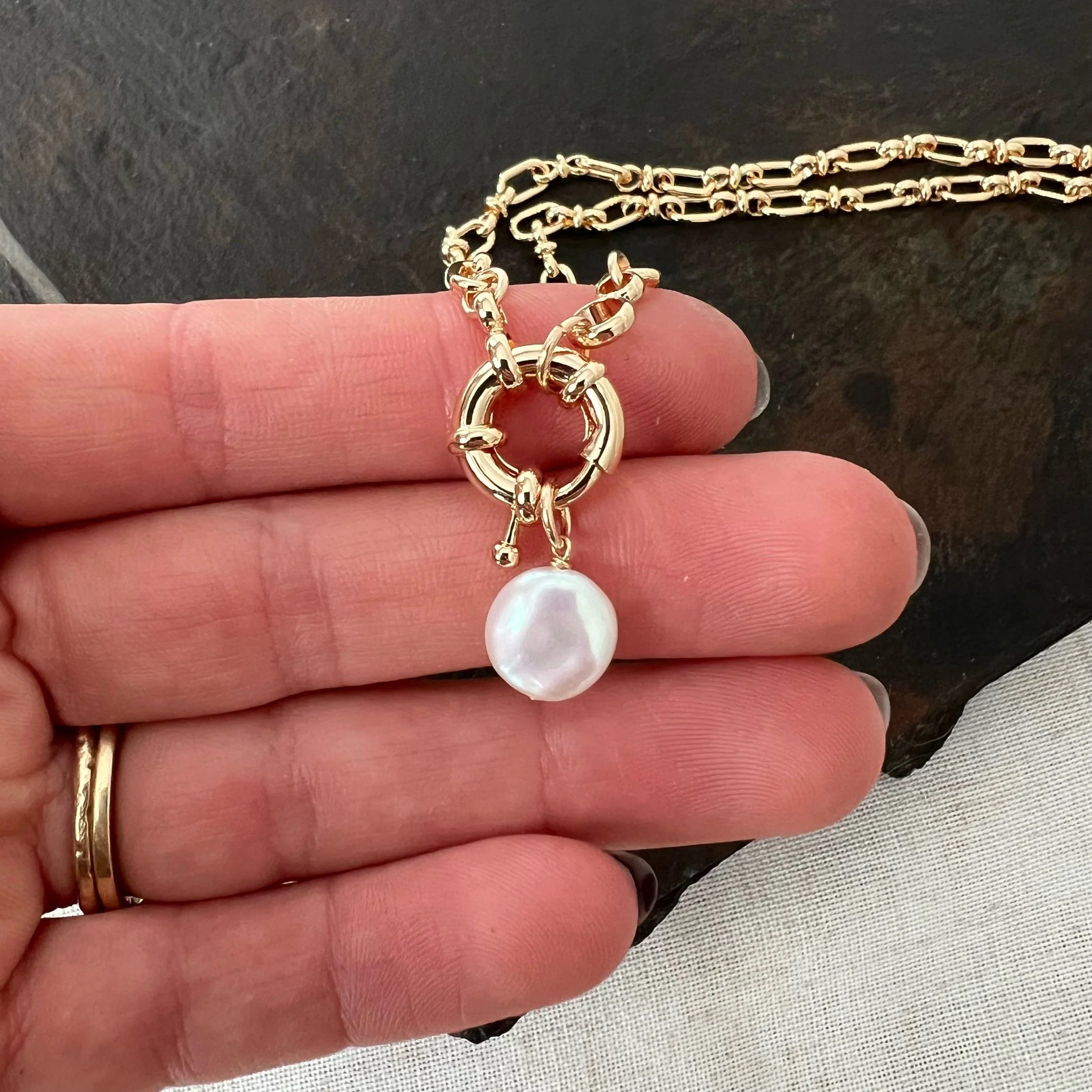 Shop › Pearl Charm Clasp Necklace Image 1 of 4 Image 2 of 4 Image 3 of 4 Image 4 of 4 Pearl Charm Clasp Necklace $55.00 sold out 14k gold plated necklaceCharm clasp opens to interchange charms Pearl gem Chain length: 17in 18in 19in 20in Sold Out Added! 14k gold plated necklaceCharm clasp opens to interchange charms Pearl gem Reviews Reviewer Name Review Date Star Rating Description Posted on Etsy Product Show More You Might Also Like Quick View Linked CZ Charm Necklace $45.00 Sold out Quick View Labradorite Carabiner Charm Necklace $60.00 Sold out Quick View Sunburst Necklace $35.00 Quick View Toggle Clasp Coin Necklace $48.00 Sold out Quick View Kyanite Carabiner Charm Necklace $60.00