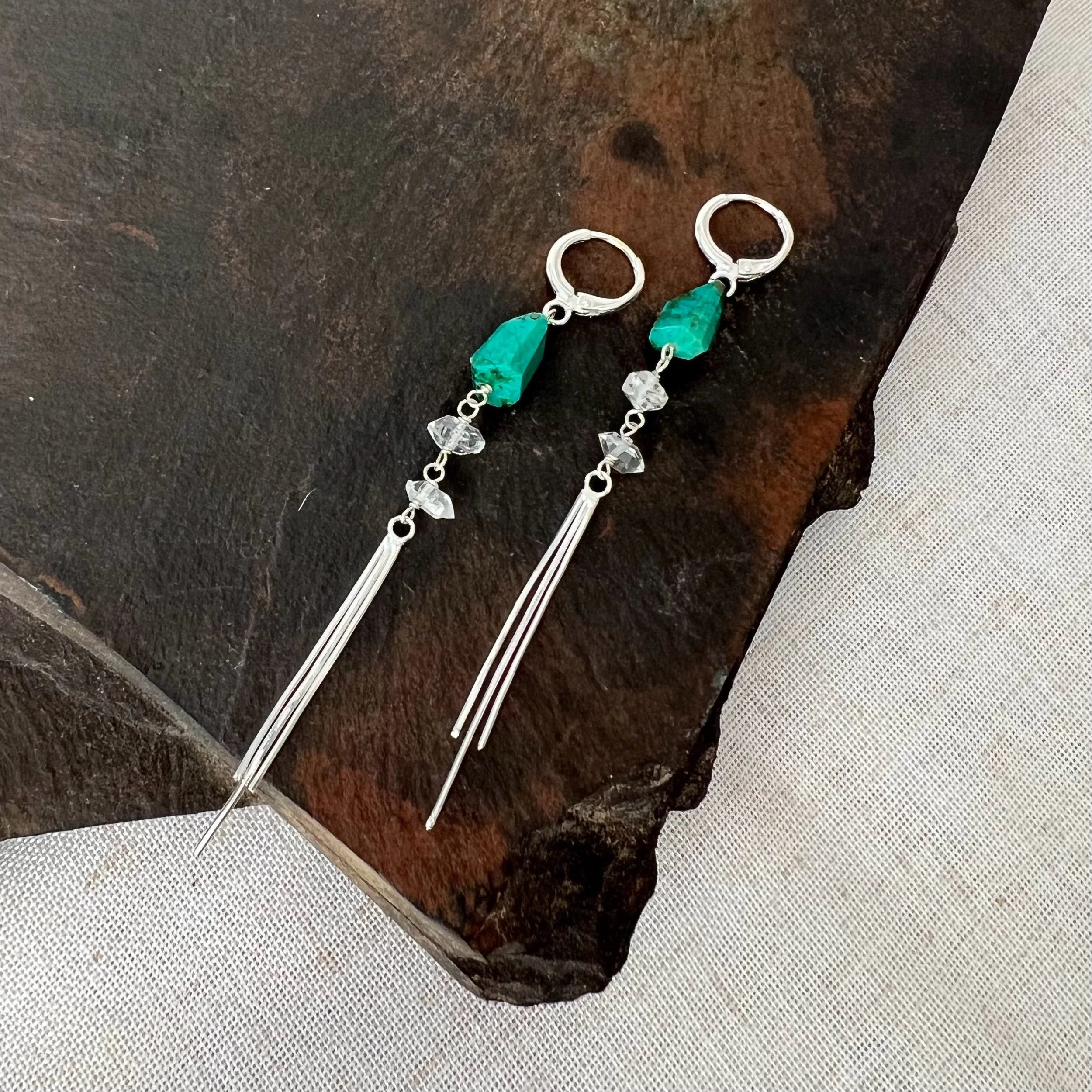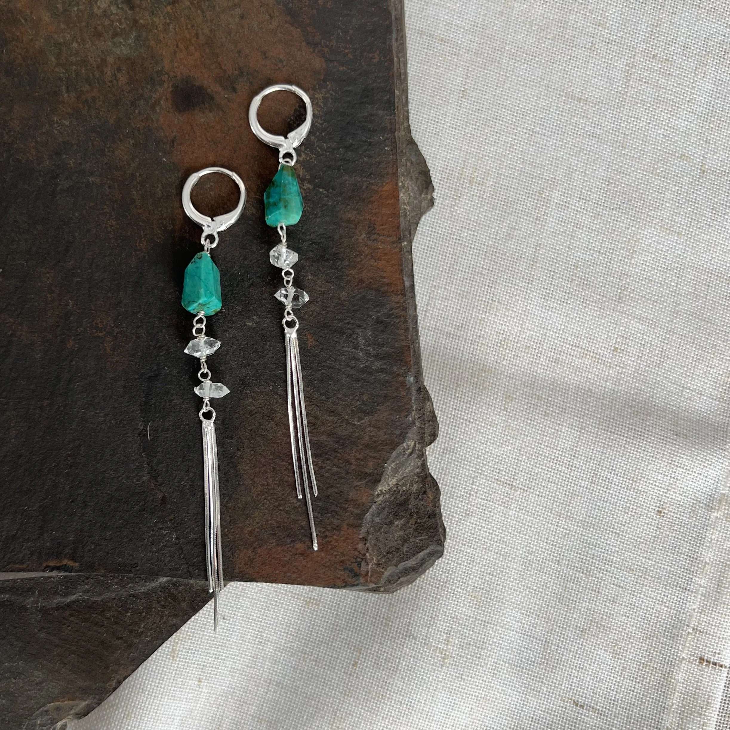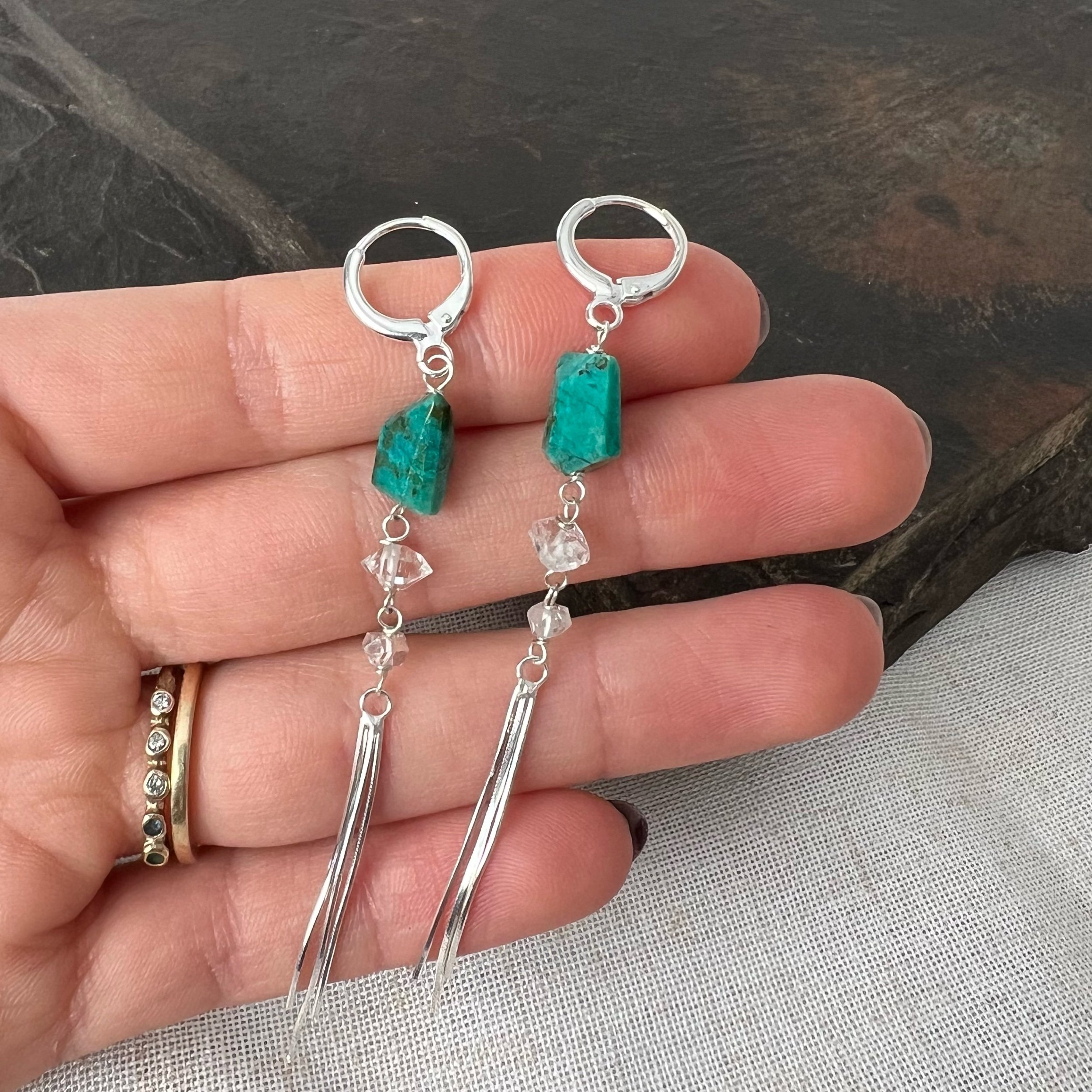 Shop › Sterling Silver Chrysocolla Earrings Image 1 of 3 Image 2 of 3 Image 3 of 3 Sterling Silver Chrysocolla Earrings $50.00 sold out Sterling silver huggie hoops and fringe chainChrysocolla and Herkimer diamond gems Sold Out Added! Sterling silver huggie hoops and fringe chainChrysocolla and Herkimer diamond gems Reviews Reviewer Name Review Date Star Rating Description Posted on Etsy Product Show More You Might Also Like Quick View Amazonite Elongated Fringe Earrings $82.00 Sold out Quick View Labradorite Elongated Fringe Earrings $82.00 Sold out Quick View Moss Agate Fringe Hoops $60.00 Sold out Quick View Tiny Pearl Huggies $25.00 Quick View Kyanite Wrap Hoops Small $58.00