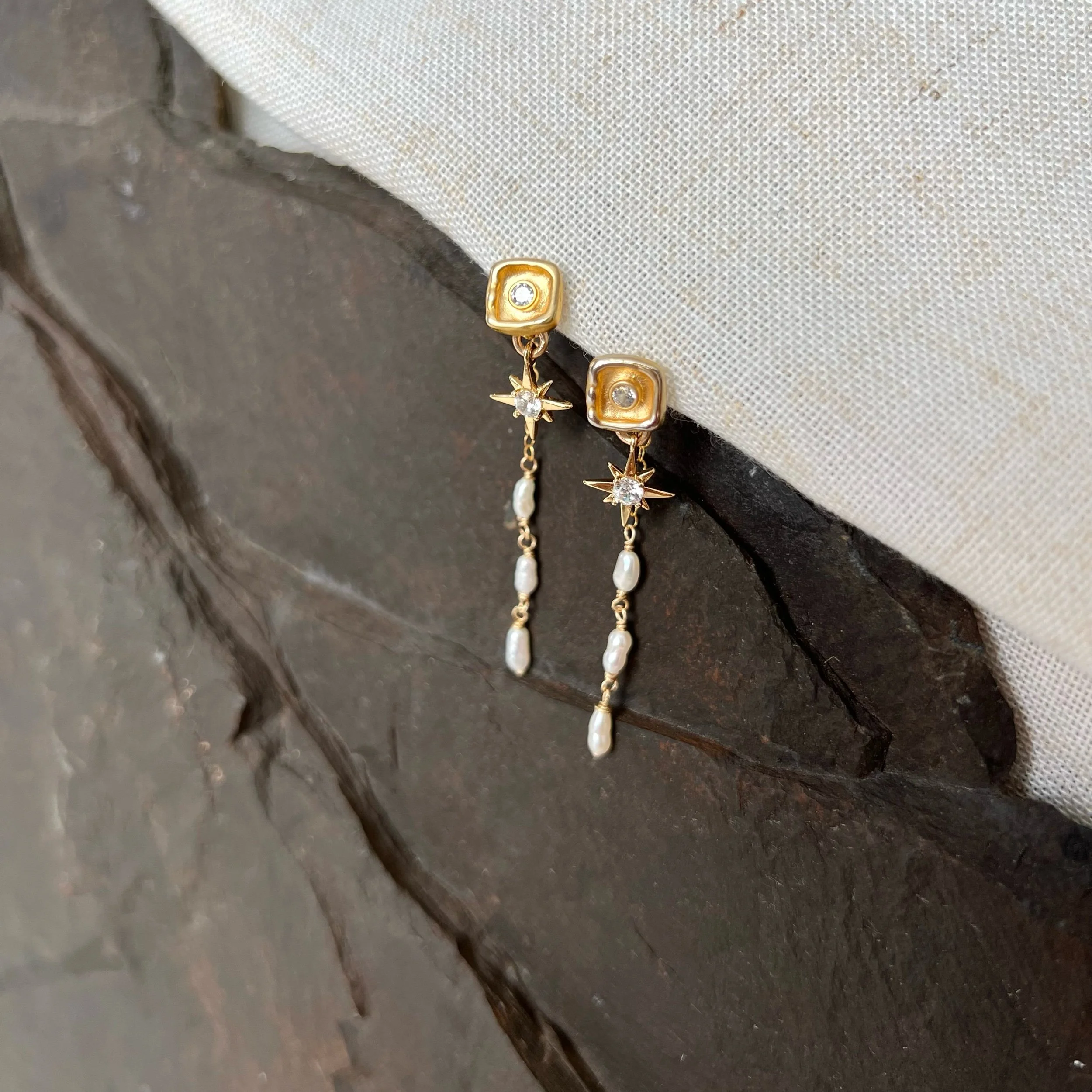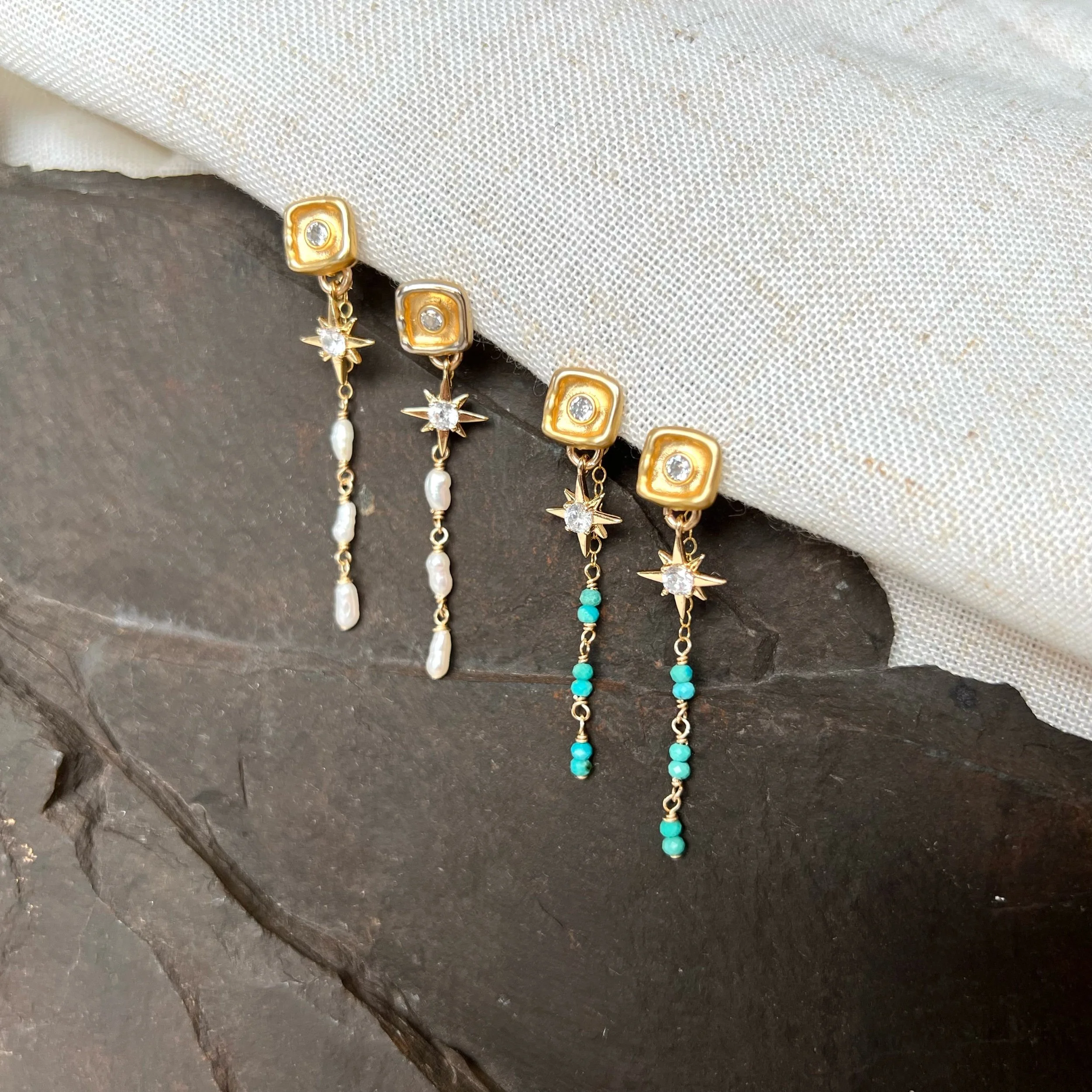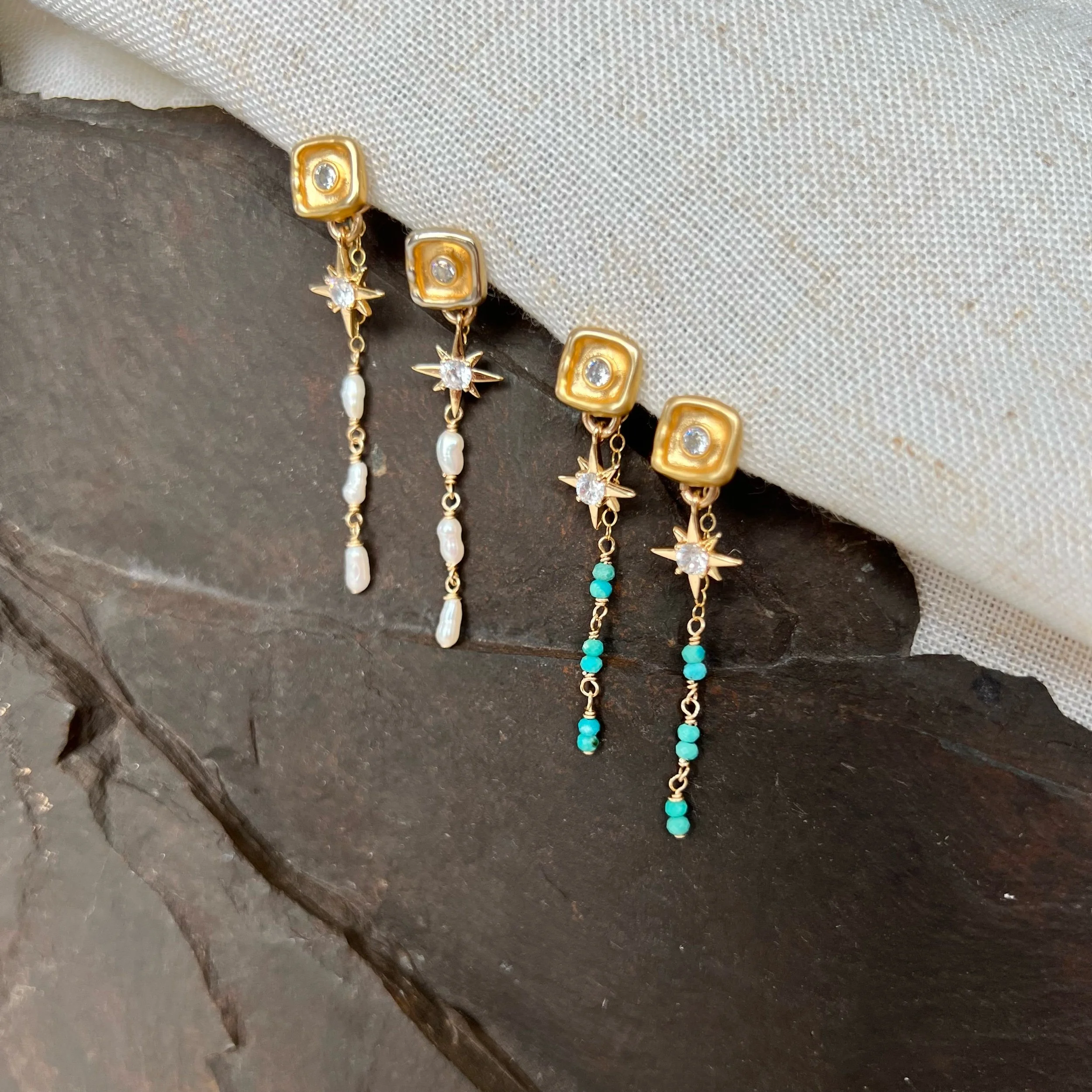 Shop › Starry Eyed Post Earrings Image 1 of 5 Image 2 of 5 Image 3 of 5 Image 4 of 5 Image 5 of 5 Starry Eyed Post Earrings $40.00 sold out 14k gold plated post earrings & star cz charmFreshwater pearls or Arizona turquoise drops Gemstone: Pearl Turquoise Sold Out Added! 14k gold plated post earrings & star cz charmFreshwater pearls or Arizona turquoise drops Reviews Reviewer Name Review Date Star Rating Description Posted on Etsy Product Show More You Might Also Like Quick View Labradorite Elongated Fringe Earrings $82.00 Sold out Quick View Tourmaline in Quartz Huggie $30.00 Quick View Black Rutile and Tourmaline Earrings $66.00 Quick View Oval CZ Huggies $20.00 Sold out Quick View Silver Kyanite Wrap Hoops Small $50.00 Sold out