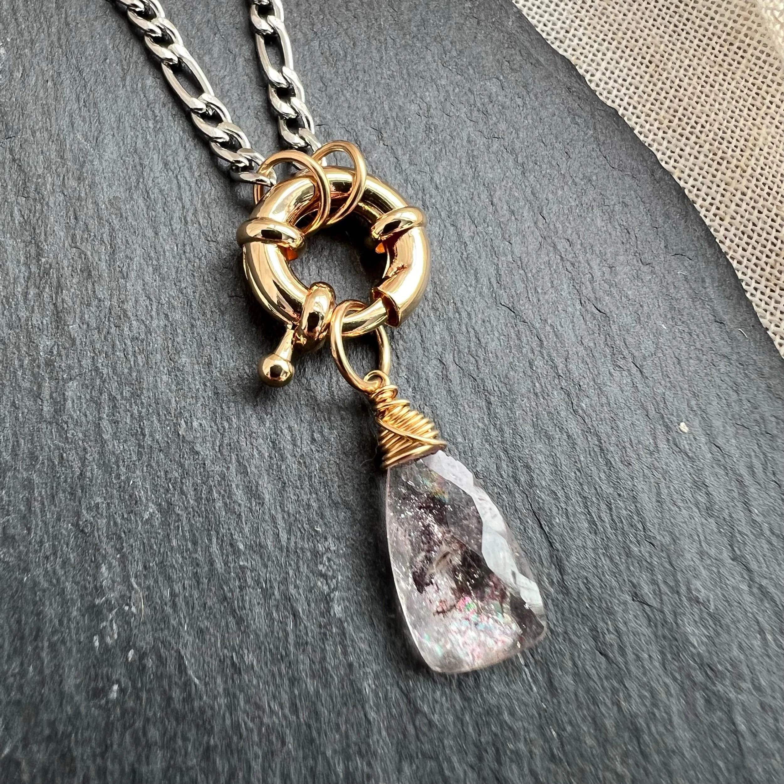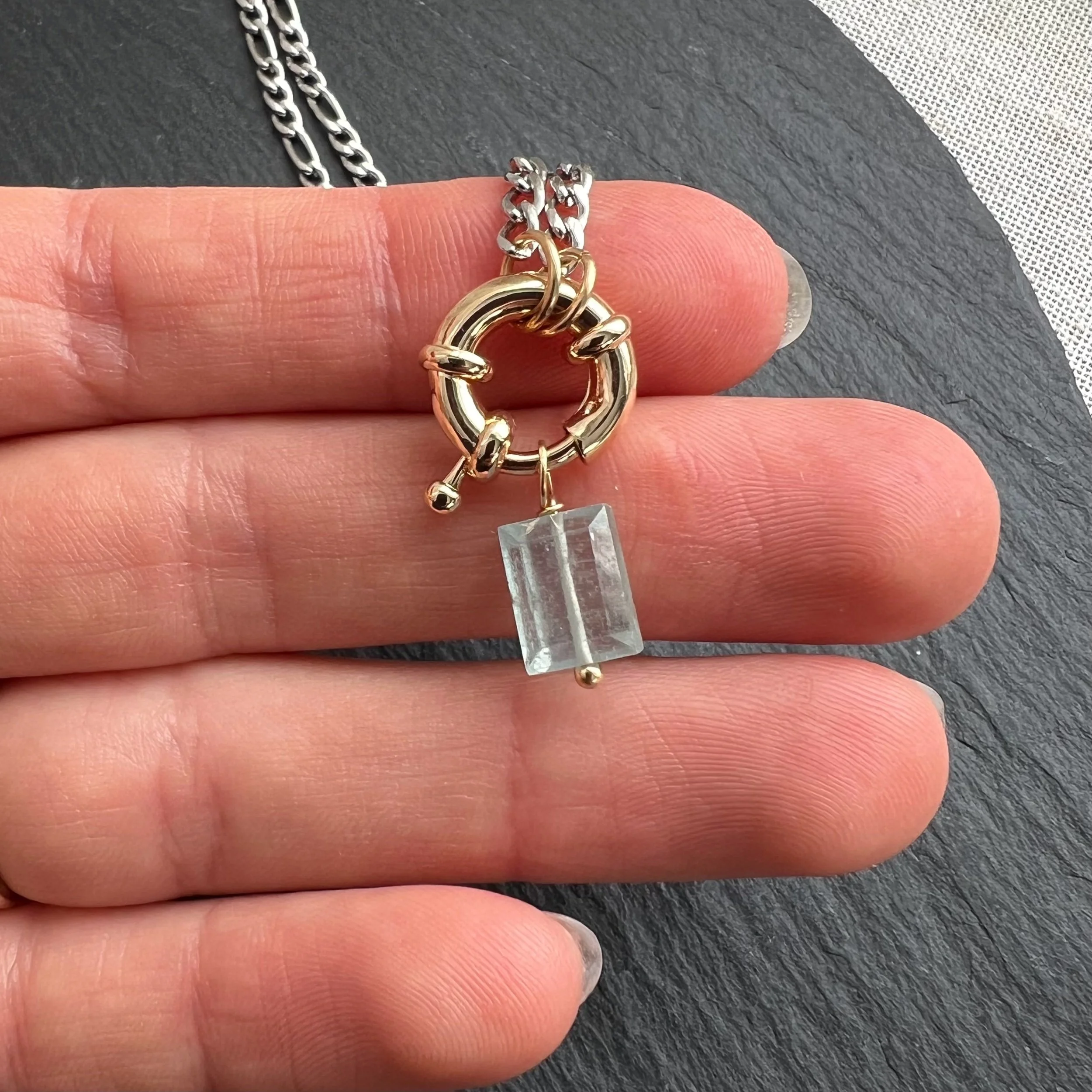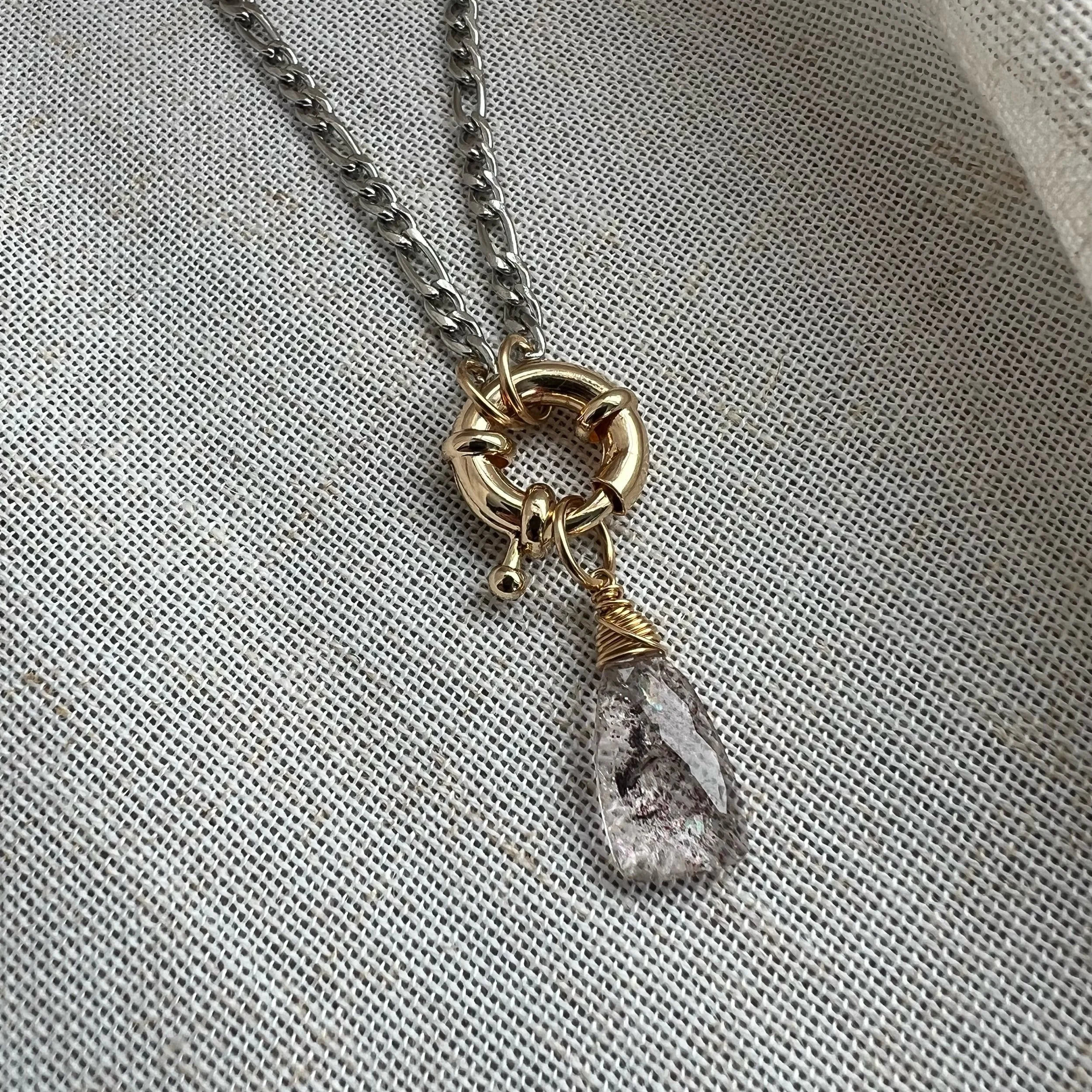Shop › Kyanite Charm Necklace Image 1 of 3 Image 2 of 3 Image 3 of 3 Kyanite Charm Necklace $55.00 14k gold plated clasp, opens to interchange charmsStainless steel chainAqua Kyanite gem Add To Cart Added! 14k gold plated clasp, opens to interchange charmsStainless steel chainAqua Kyanite gem Reviews Reviewer Name Review Date Star Rating Description Posted on Etsy Product Show More You Might Also Like Quick View Lepidocrocite Charm Necklace $55.00 Quick View Fish Carabiner Charm Necklace $60.00 Quick View Labradorite Carabiner Charm Necklace $60.00 Sold out Quick View Kyanite Carabiner Charm Necklace $60.00 Quick View Northstar Coin Necklace $35.00
