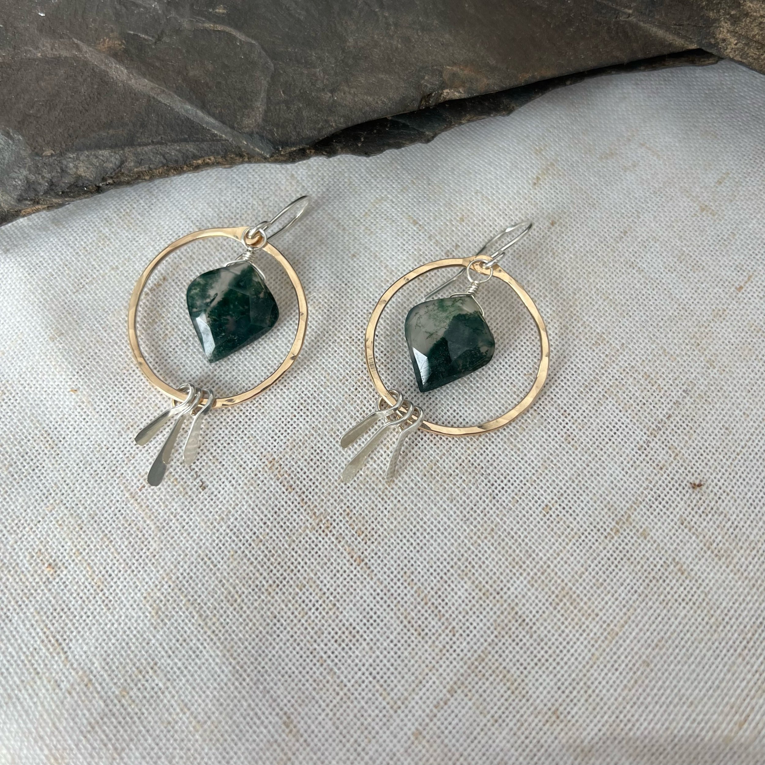 Shop › Moss Agate Fringe Hoops Image 1 of 3 Image 2 of 3 Image 3 of 3 Moss Agate Fringe Hoops $60.00 sold out 14k gold-fill and sterling silver Moss agate gemstones Sold Out Added! 14k gold-fill and sterling silver Moss agate gemstones Reviews Reviewer Name Review Date Star Rating Description Posted on Etsy Product Show More You Might Also Like Quick View Twist Huggies $20.00 Quick View Double Hoop Huggies $20.00 Sold out Quick View Aqua Kyanite Huggies $30.00 Quick View Herkimer Diamond Huggies $30.00 Quick View Two Tone Petal Earrings $45.00